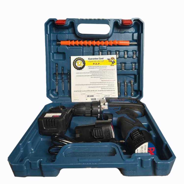 دریل پیچ گوشتی شارژی 12 ولت 2 باظری با لوازم پی ای پی مدل 1225
