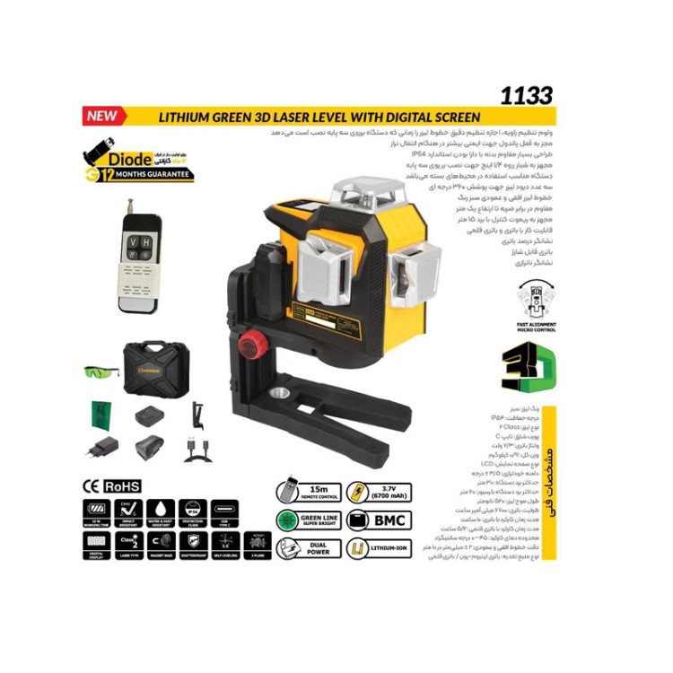 ن تراز لیزری سه بعدی نور سبز کنزاکس ساخت کشور چین است که با بهره وری از بهترین دستگاه های پیشرفته و تکنولوژی روز دنیا به بازار عرضه شده است. تراز های لیزری جزء ابزارآلات اندازه گیری هستند که به منظور پیدا کردن نقاط تعادل و تراز نسب سنجی شیب مختصات در صنایع معماری و نقشه کشی برای ساختمان و راه سازی مورد استفاده قرار می گیرند. تراز لیزری دارای انواع مختلف نور قرمز ، نور سبز ، دو خط ، سه خط و نقطه زن می باشد.تراز لیزری سه بعدی کنزاکس مدل 1133 دارای بدنه ای از جنس پلاستیک با طراحی ارگونومیک و روکش پلیمری TPR ضد ضربه و خوش دست با استاندارد IP54 و وزن بسیار سبک می باشد. این تراز لیزری مجهز به نور سبز عمودی و افقی 360 درجه به صورت همزمان و مجزا و حداقل برد 30 متر و حداکثر برد با آشکار ساز 60 متر می باشد. تراز لیزری 1133 با کلاس لیزر 2 و دامنه خود ترازی 3.5 ± درجه کار با دقت اندازه گیری 2 ± میلی متر در هر 10 متر یا 0.02 میلی متر محاسبه را دقیق انجام می دهد. این تراز لیزری کنزاکس دارای سیستم پاندولی هوشمند برای تراز شدن اتوماتیک و قفل پاندولی است. باتری این محصول 6700 میلی آمپر ساعت با قدرت 3.7 ولت از نوع لیتیومی با پورت شارژر تایپ C، تا 10 ساعت مداوم به شما شارژدهی خواهد کرد، همچنین مجهز به دو منبع تغذیه مجزا برای باتری قلمی و باتری لیتیوم یونی نیز می باشد. همچنین خاموش شدن خودکار تراز لیزری برای بهینه کردن مصرف انرژی باتری و بالا بردن عمر مفید را نیز دارد. دارای رزوه پایه 1.4 اینچ برای نصب تراز روی پایه های دیواری و آهنربایی می باشد. این تراز جدید مناسب برای محیط های بسته بوده و مجهز به ریموت کنترل با برد 15 متر نیز می باشد.