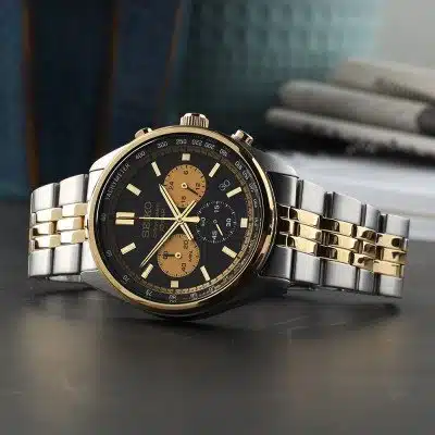 اصالت برند ژاپن ضمانت دو ساله شرکت توسعه کالای دماوند مناسب برای آقایان نوع موتور کوارتز منبع انرژی باتری کشور سازنده موتور ژاپن شکل قاب گرد سایز قاب 41 رنگ قاب سیلور جنس قاب استیل صفحه نمایش آنالوگ رنگ صفحه طلایی, مشکی نوع شیشه هاردلکس نوع بند استیل رنگ بند سیلور طلایی نوع قفل کلیپسی تقویم دارد عقربه شب نما ندارد مقاومت در برابر آب استخری (100 متر) اصالت کالا اصل